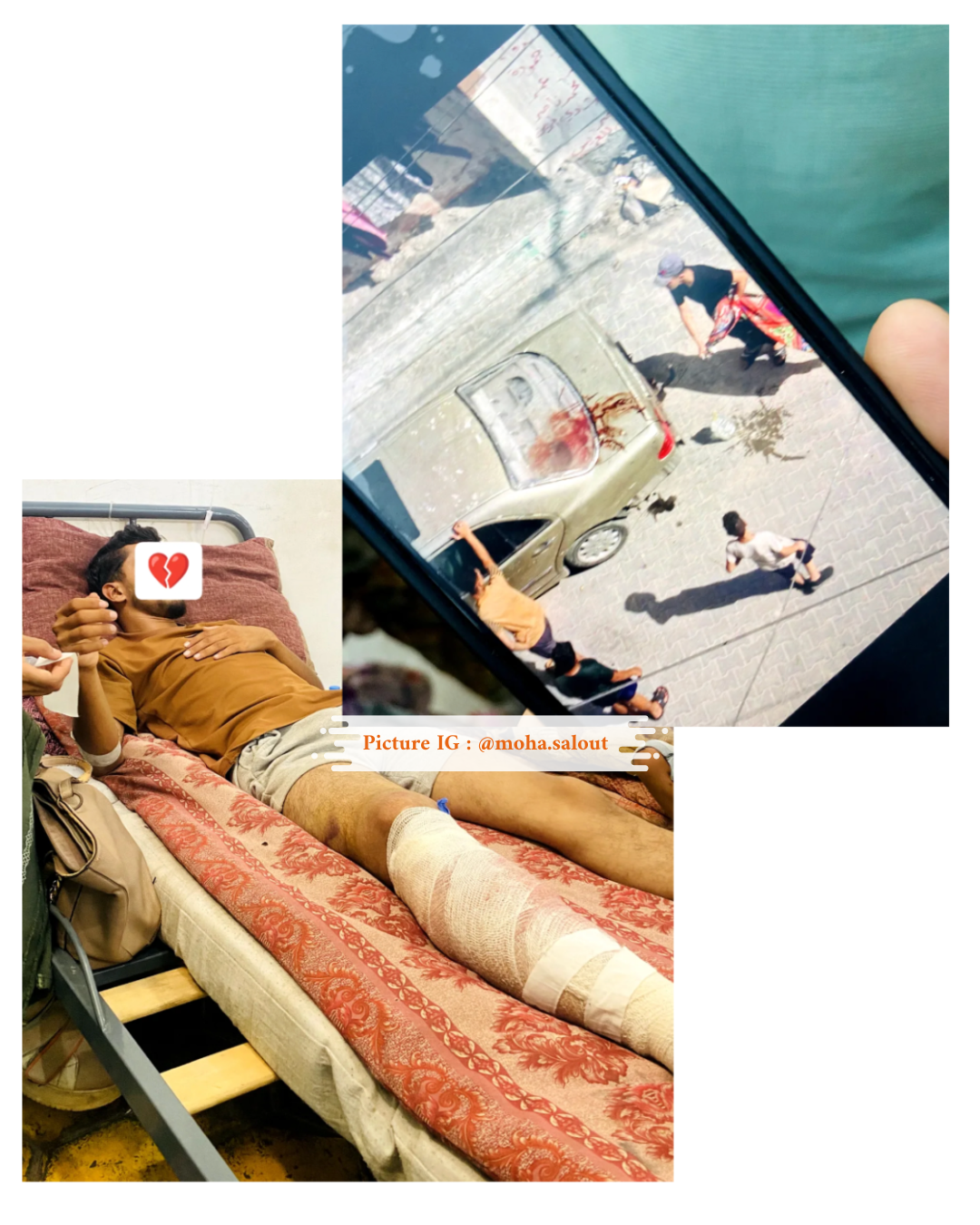 Melihat situasi yang berbahaya, saya dan keluarga mencoba pindah ke daerah lain yang lebih aman. Namun saat di perjalanan, mobil kami terkena bom acak oleh tentara isra***el.